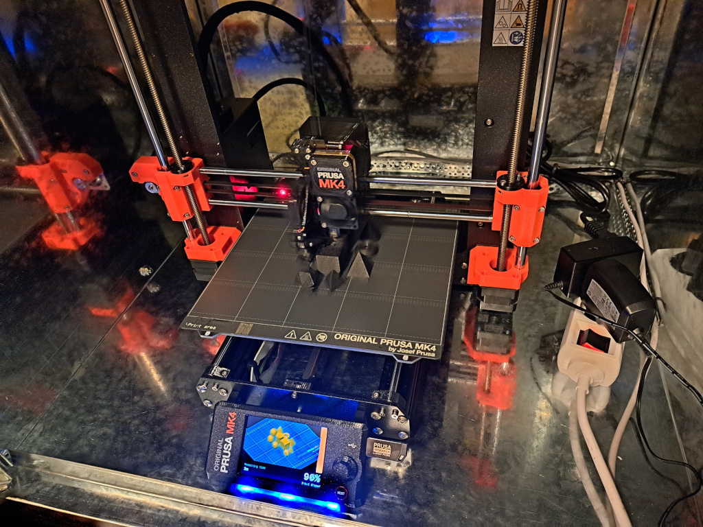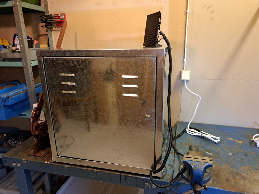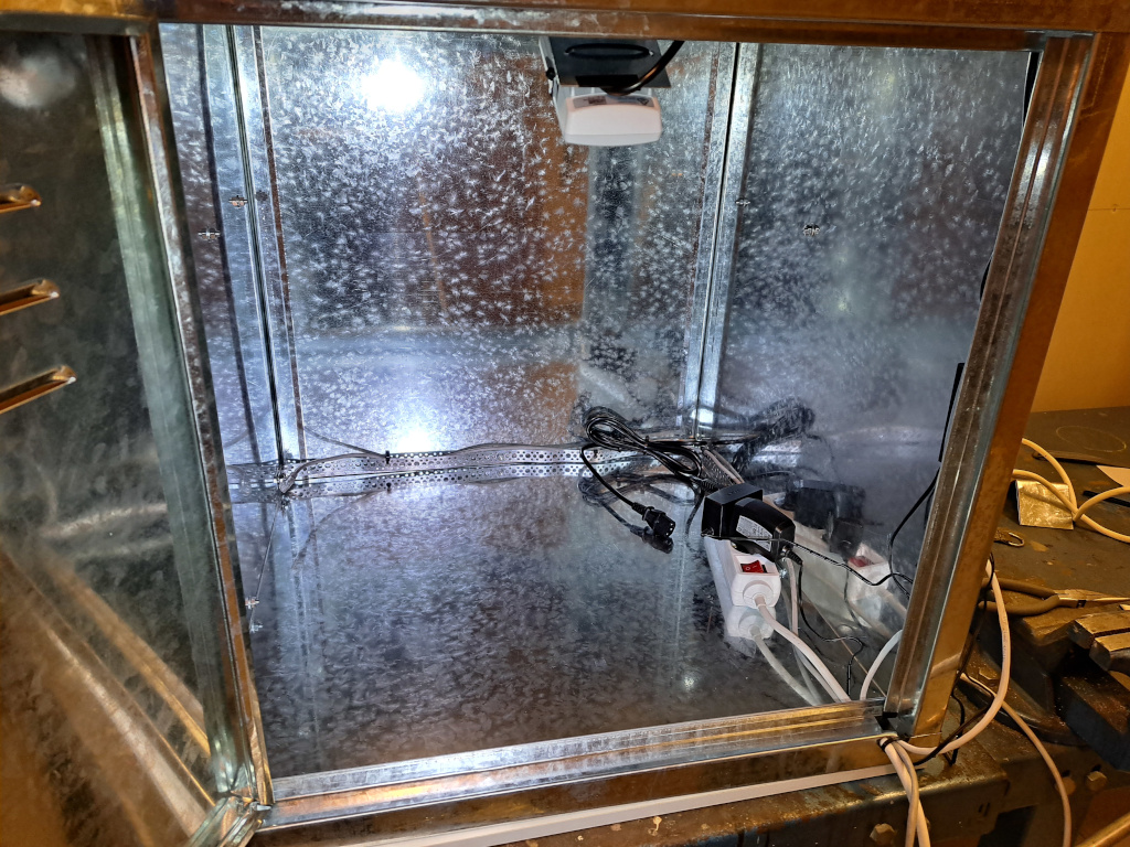 This enclosure for my Prusa Mk4 3D printer keeps it free from dust in my workshop. It is a Wiesenfield WIE-SC-600 saddle locker which with its 60x60x60 cm leaves enough room for the printer with filament and some cabling. The bolted steel sheet construction made it easy to add fixing bands for cable mounts.