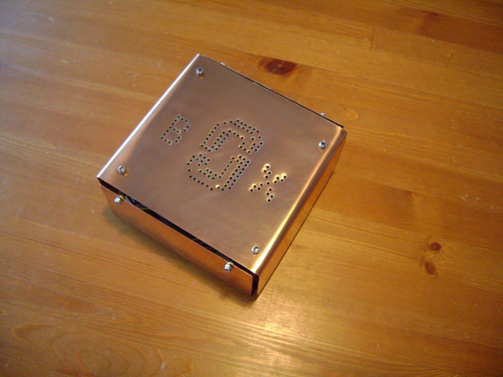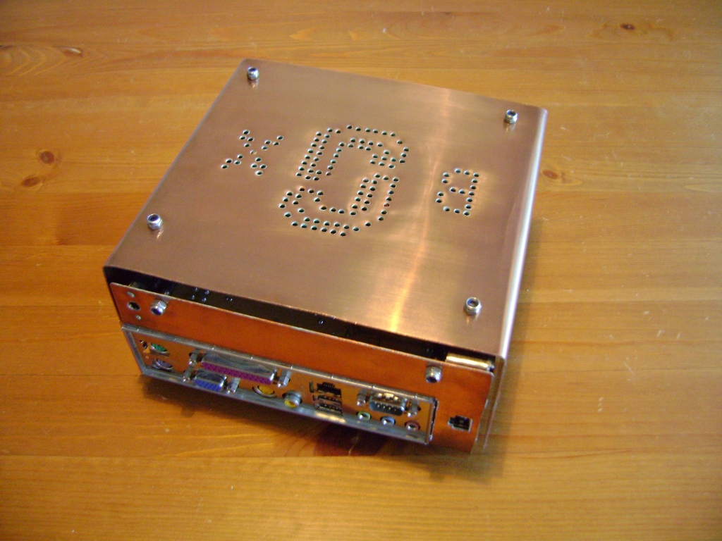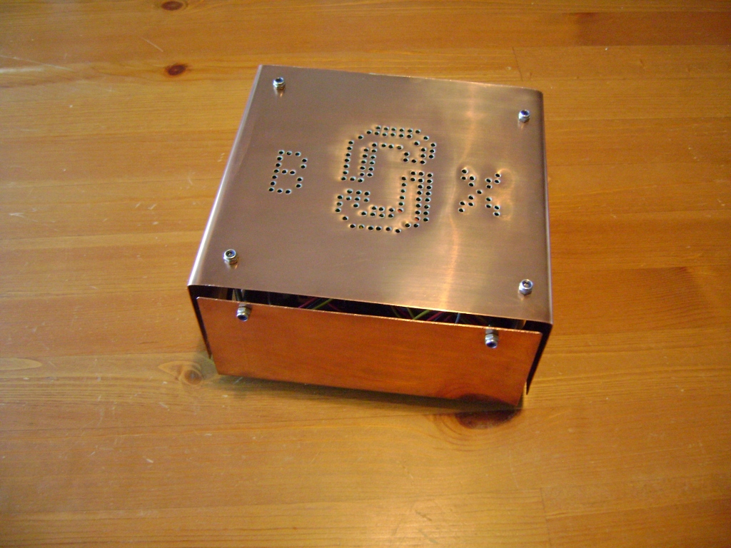 J-Box is my second computer case I have built from scratch. It is a very simple construction based on two bent sheets of copper joined by seven threaded round rods that also hold the internal components in place. I built the case in 2004 and extended it with some custom electronics in 2005.