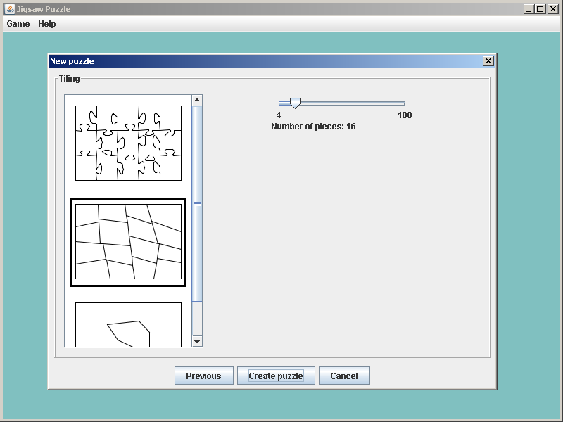 A picture for the puzzle can be procedurally generated with one of the built-in functions or loaded from an external file. There is also a multitude of methods to generate different tilings and edges.