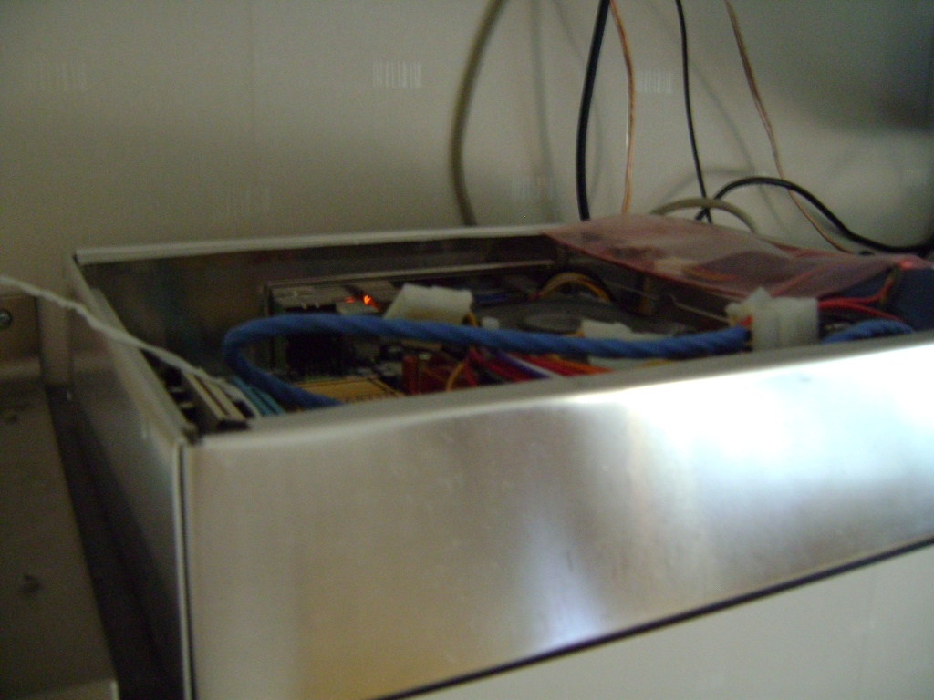 I chose to build it out of aluminum because it is easy to work with and to keep the weight down. The PSU is of a nonstandard form factor to keep the size down. The front is removable, held in place by two bolts, for easy access when mounting new hardware.