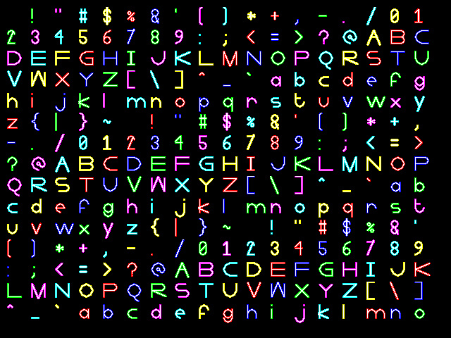 Vector representation of glyphs enable scalable high resolution Scanline Rendering. Using up to three lines and three arcs with simple transformations all writable 8-bit UTF-8 glyphs are represented. The primitives and operation can easily be expressed as Signed Distance Functions (SDFs). Sampling the SDF provide the nearest distance to the glyph and a simple threshold can be used to control thickness.
