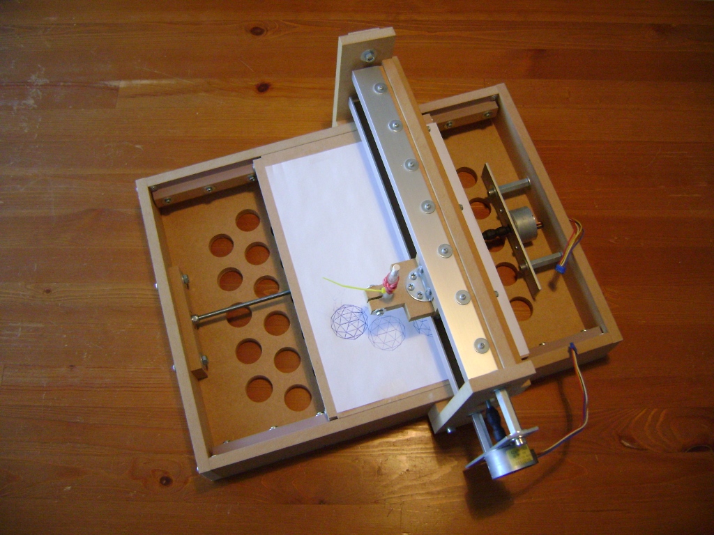 The hardware my friend provided is based on a very neat and sturdy wooden frame. Stepper motors are used to move the table in the Y direction and the head in the X direction. There is no Z direction yet but the head is interchangeable and can support a lightweight contraption in the future.