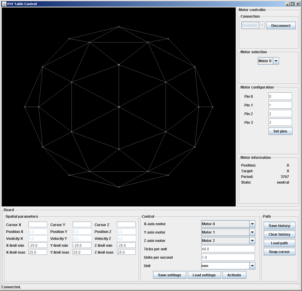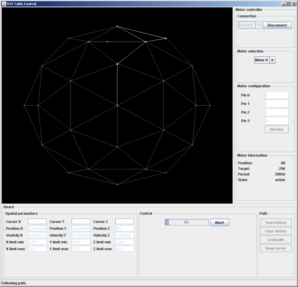 On the PC side there is a thin native layer (C++) for dealing with communication. It also hosts a simple emulator which was easy to do since very little actual functionality is in the controller. Atop of that there is a Java GUI for high-level operations such as 3D path following and configuration.